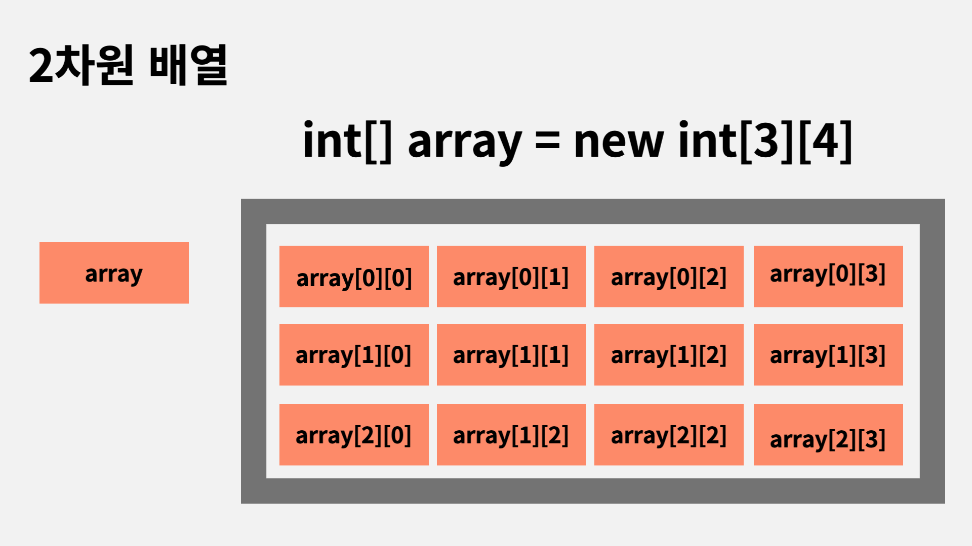 - new int[3][4]에서 2차원 배열의 세로 길이는 3을, 가로 길이는 4임을 의미합니다.