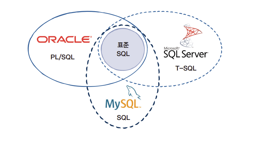 다음 그림과 같이 각 회사의 제품은 모두 표준 SQL을 공통적으로 사용할 수 있으며, 각 회사 제품의 특성에 따라 호환되지 않는 SQL문이 있습니다.