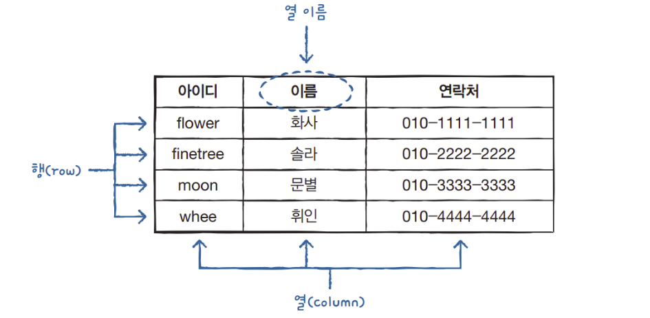- 데이터베이스는 “테이블”이라는 최소 단위로 구성되어 있습니다.