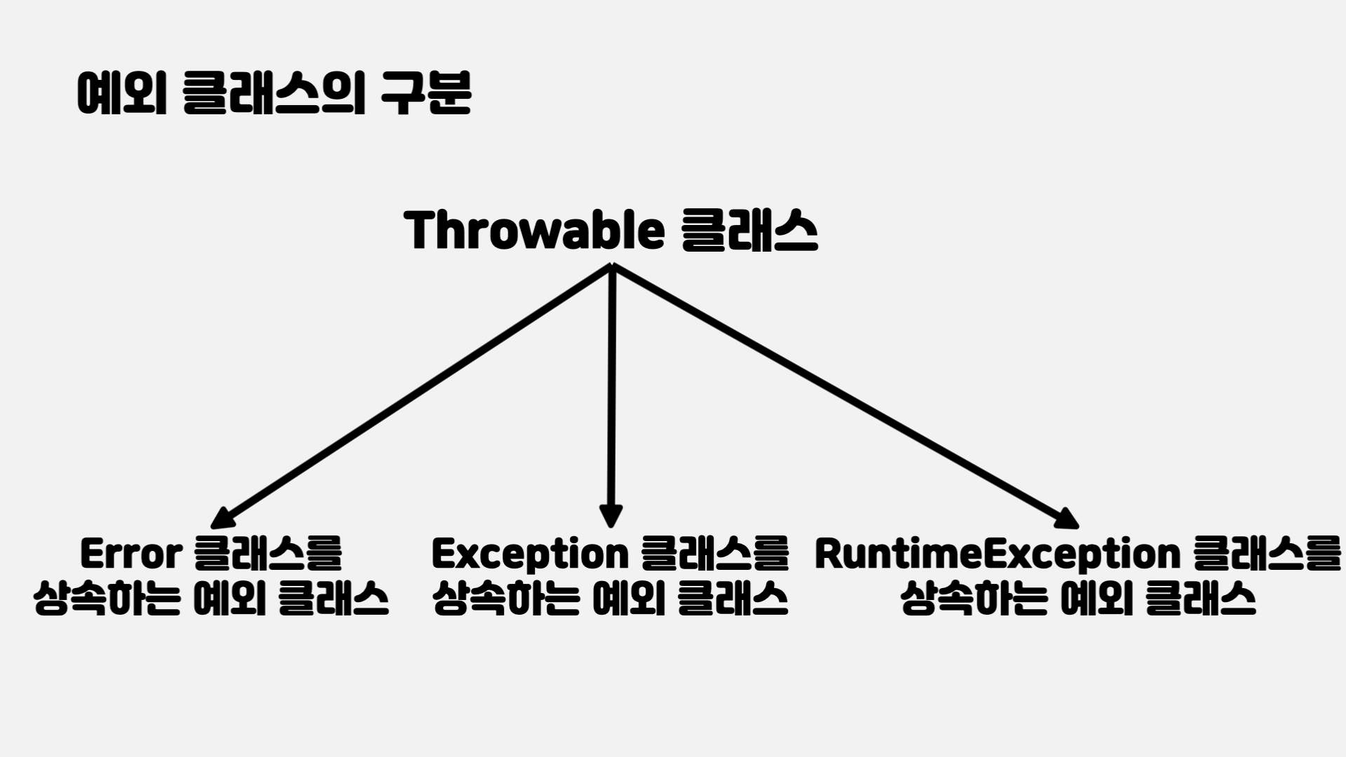 💡 이처럼 자바는 예외 상황별로 그 상황을 알리기 위한 클래스를 정의하고 있습니다.