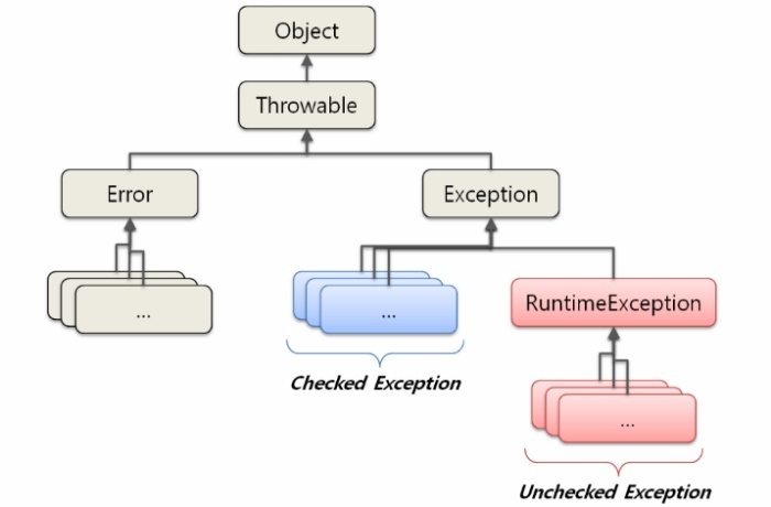 그러나 RuntimeException 클래스를 상속하지 않고 Exception 클래스를 상속하는 예외는 try ~ catch문으로 처리하거나 다른 영역으로 넘긴다고 명시해야 합니다.