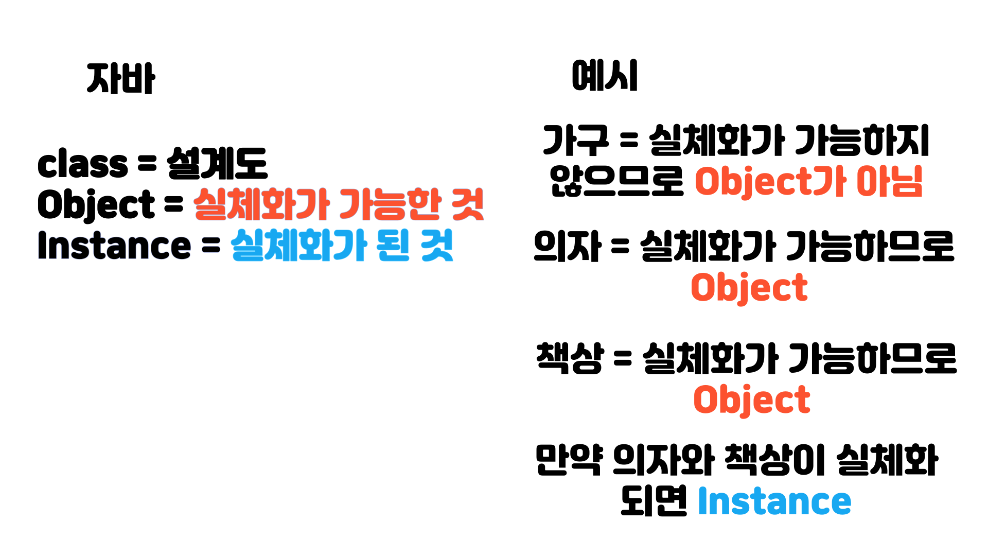 위의 예시를 살펴보면 가구는 실체화가 가능하지 않으므로 Object가 아니라고 소개했습니다.