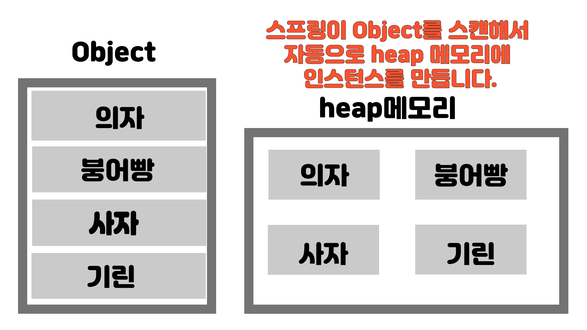 이전에 스프링이 코드를 스캔해서 모든 Object를 heap메모리에 띄운다는 점을 알아봤습니다.(IOC = 스프링이 인스턴스들을 관리함)
