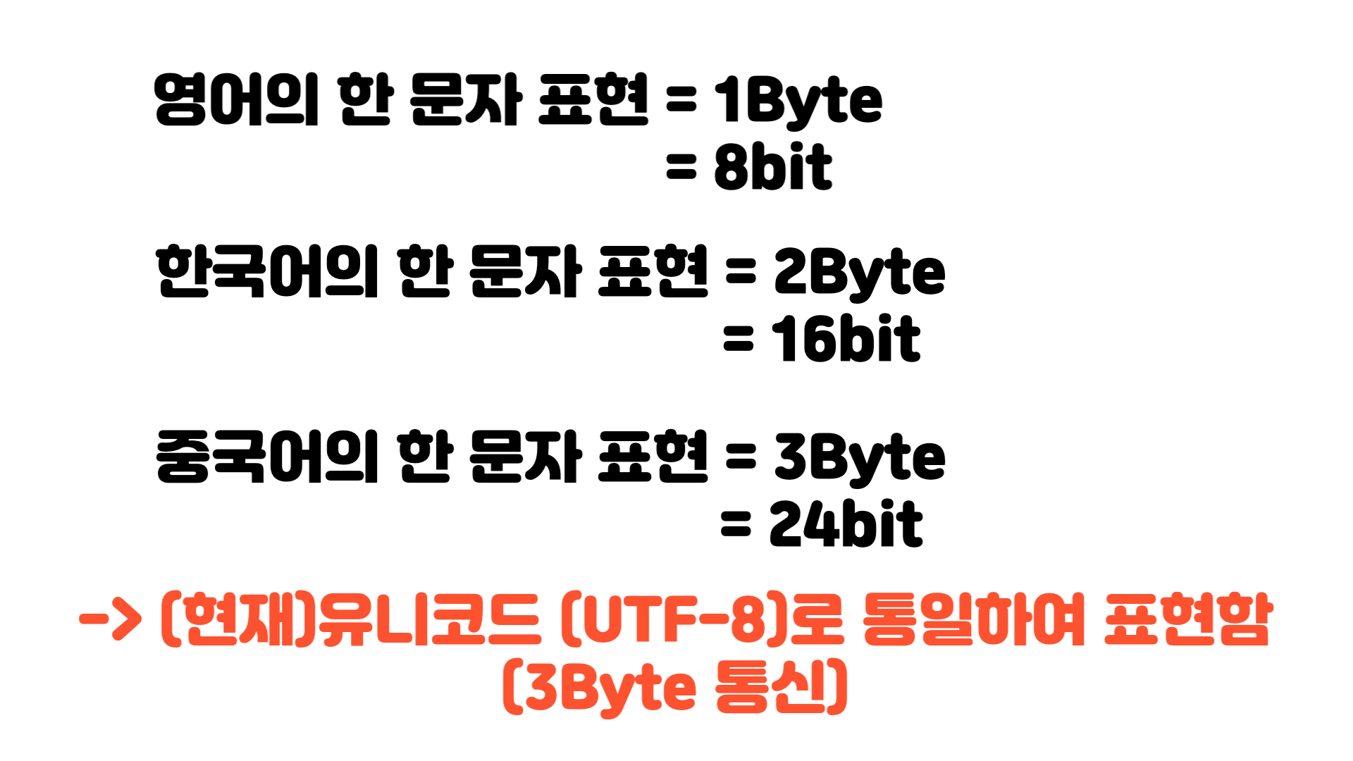 이처럼 세상의 문자 표현이 각각 다른 Byte가 필요하는데 현재에는 유니코드를 이용하여 모든 글자를 표현하고 있습니다.(3Byte 통신)