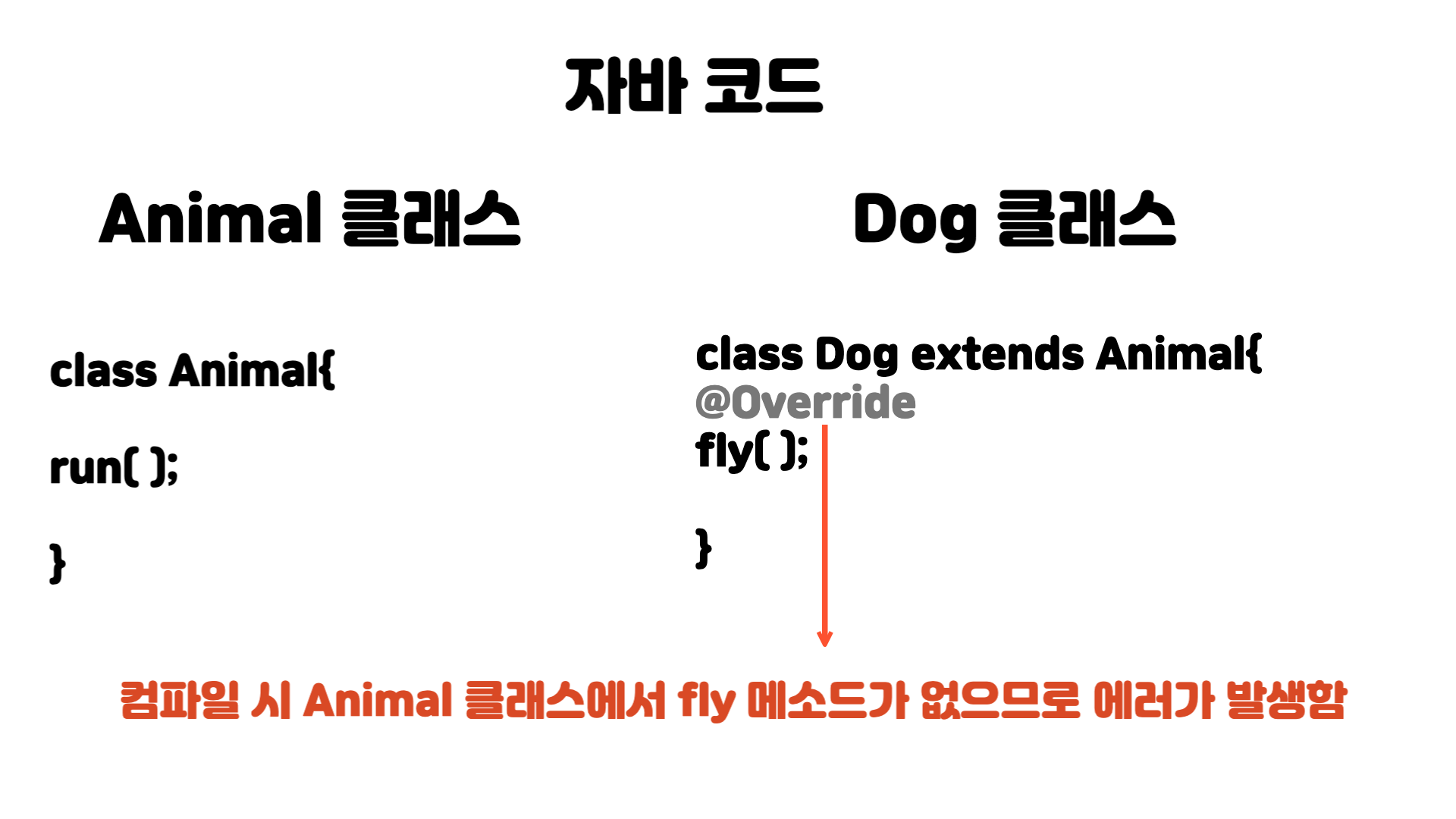 위의 Dog클래스 코드의 경우 컴파일 체킹시 Animal 클래스에 fly메소드가 없으므로 에러가 발생합니다.