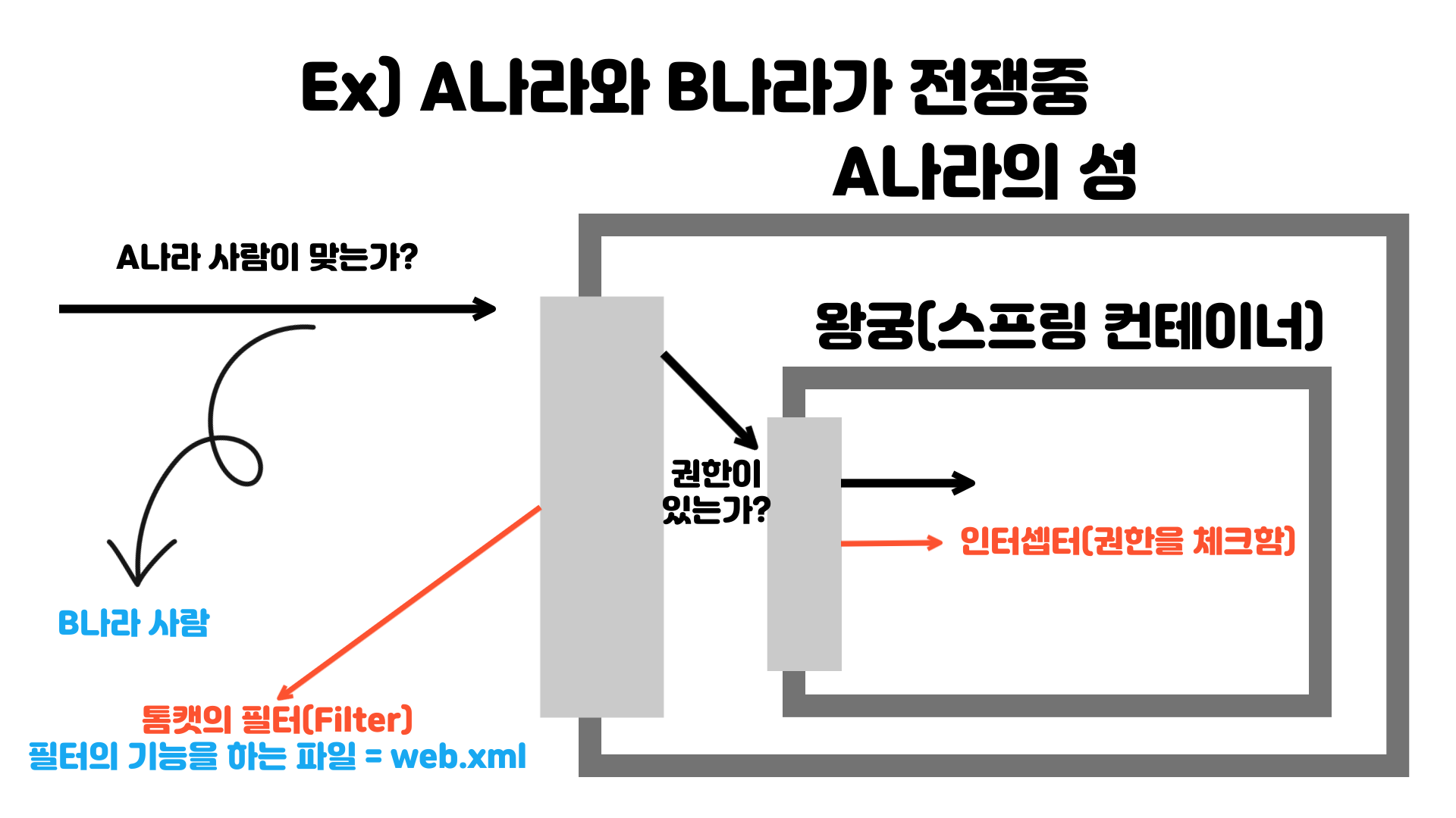 이처럼 왕궁(스프링 컨테이너)에 들어갈 권한이 있는지 체크하는 것이 인터셉터라고 합니다.