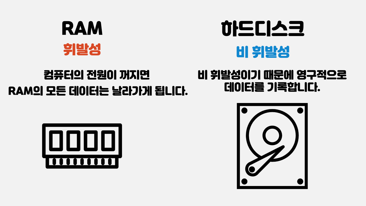 컴퓨터에서의 데이터를 읽고 접근할 수 있는 방법에는 휘발성인 RAM과 비 휘발성인 하드 디스크가 있는데 각각의 특징은 다음 그림과 같습니다.