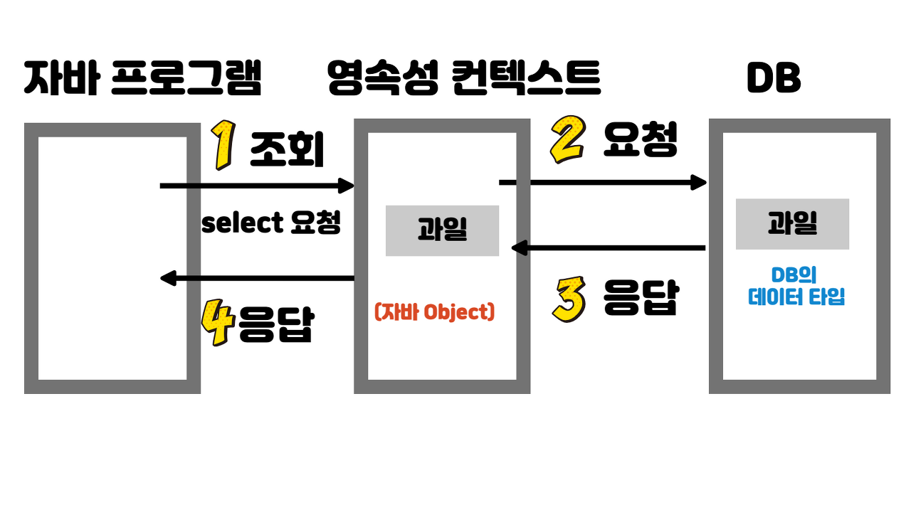 1. 자바 프로그램에서 영속성 컨텍스트에게 과일 데이터를 조회를 요청합니다.(Select 요청)