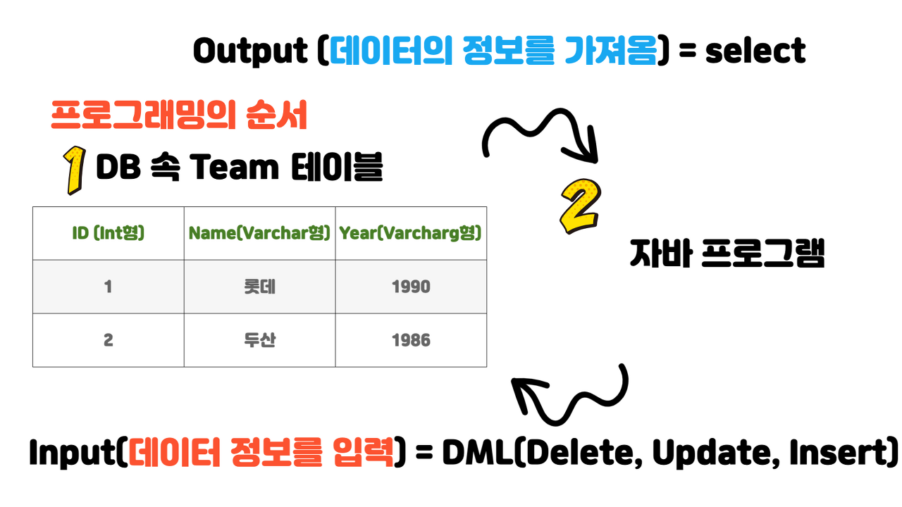 🔥 먼저 1.DB 속 Team의 테이블을 만든 후 2.자바 프로그램에에서 이를 이용하도록 프로그래밍하게 됩니다.