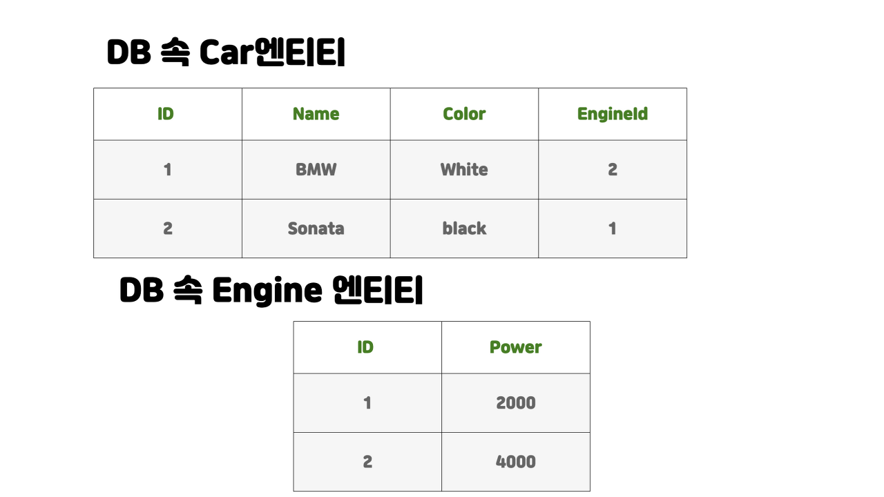 JPA를 통해 위의 Car클래스와 Engine 클래스는 다음과 같이 생성됩니다.