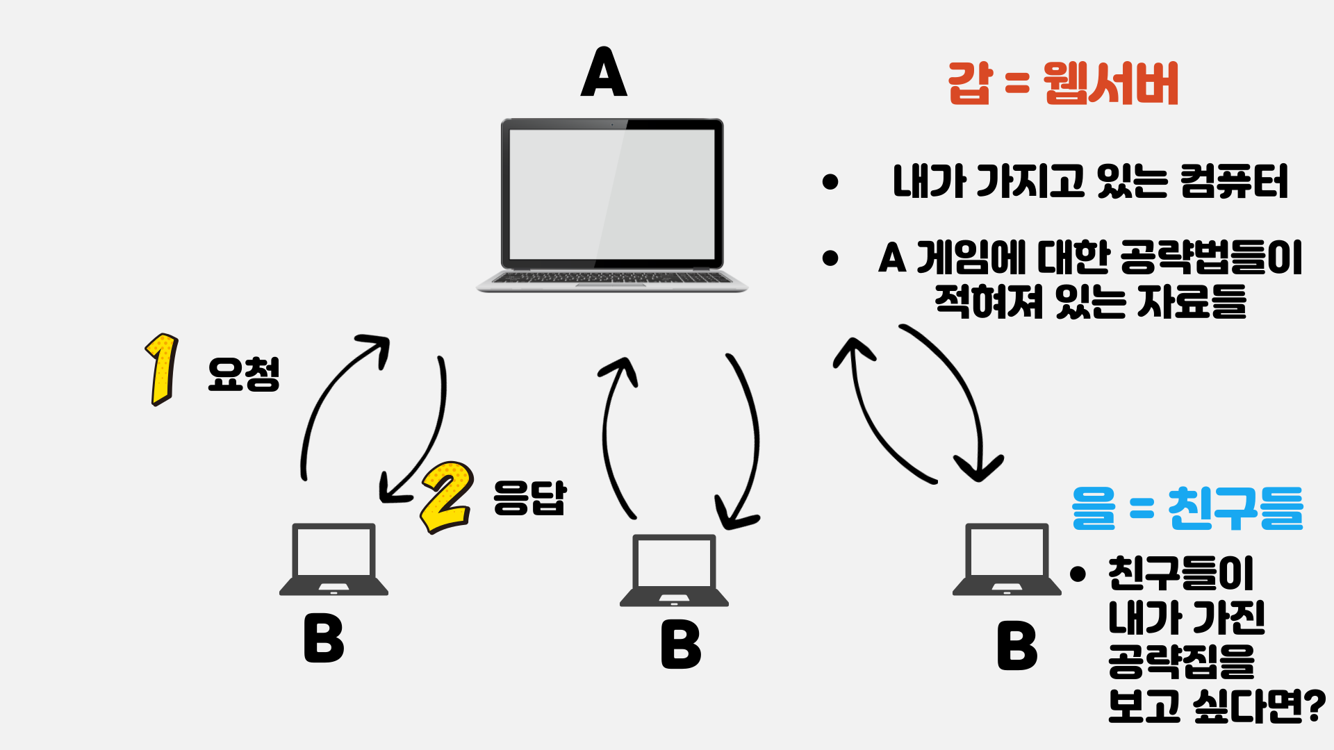 - 이때 내 컴퓨터(갑)은 친구들의 컴퓨터(을)가 어디있는 상관 없이 요청에 대한 응답만 하면 됩니다.
