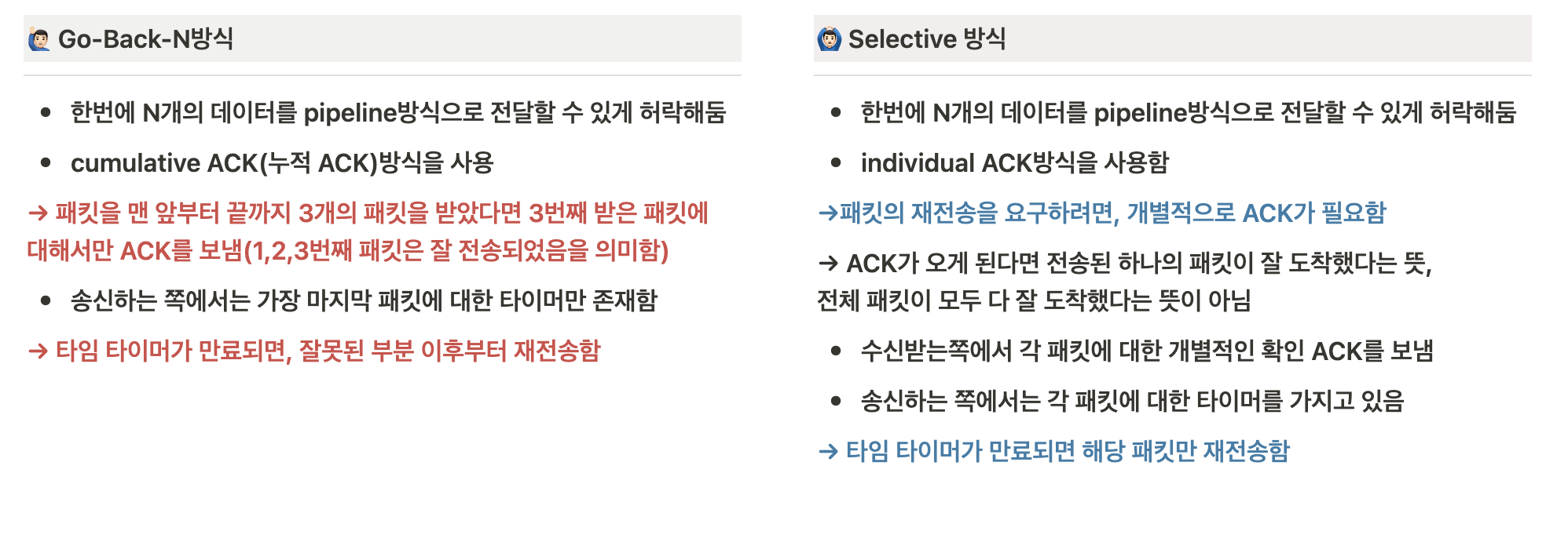 - go-back-N 방식, selective repeat 방식으로 구분됨