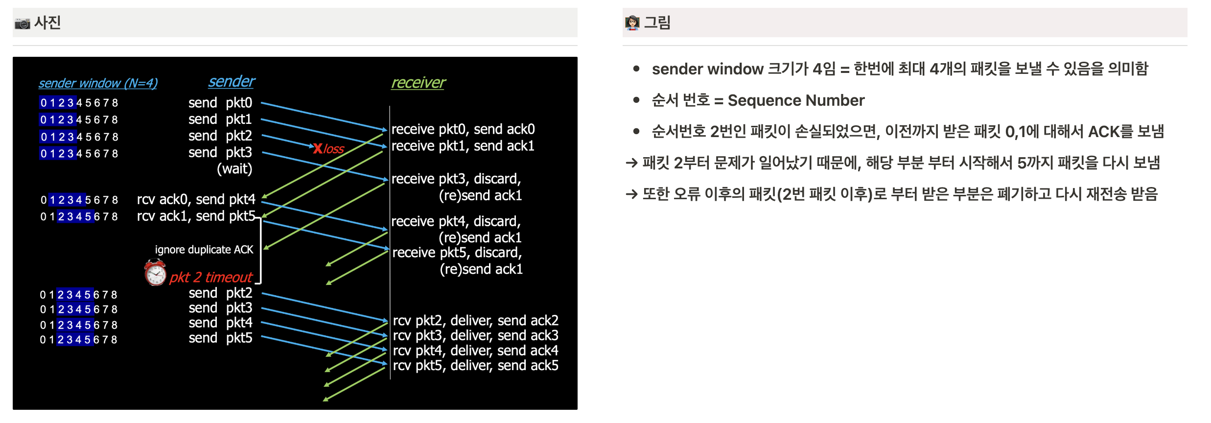 - Go-Back-N방식은 Receiver가 받은 패킷을 판단해보니, 해당 패킷 이후 부터 잘못 되었다고 하면 Sender는 해당 패킷 이후부터 모두 재전송을 해야 함