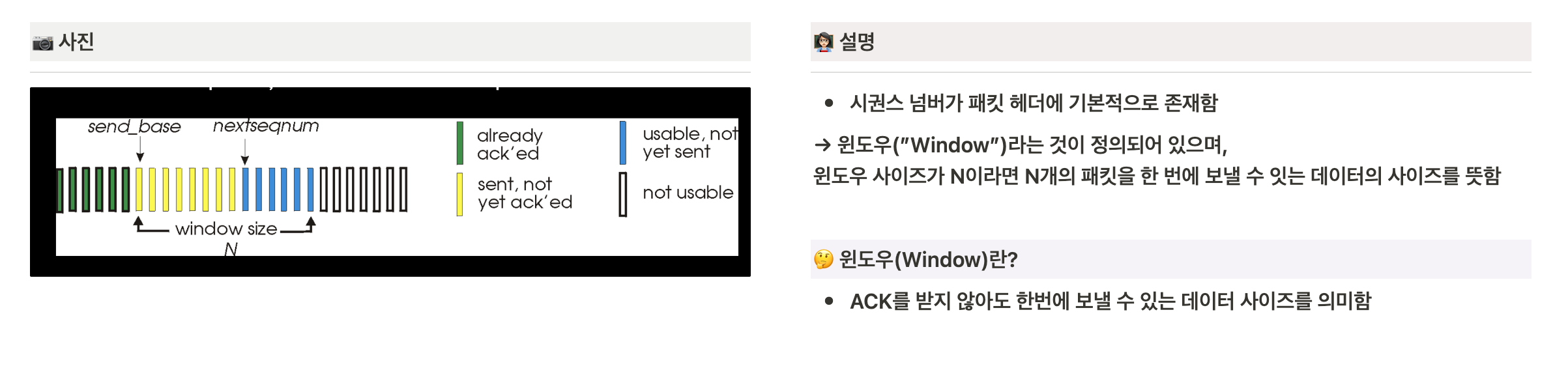 - 파란색 부분 = Window사이즈가 N이며, 아직 해당 부분을 더 보낼 수 있다는 부분(ACK가 도달하지 않아도, 이부분까지는 더 보낼 수 있음을 의미함)