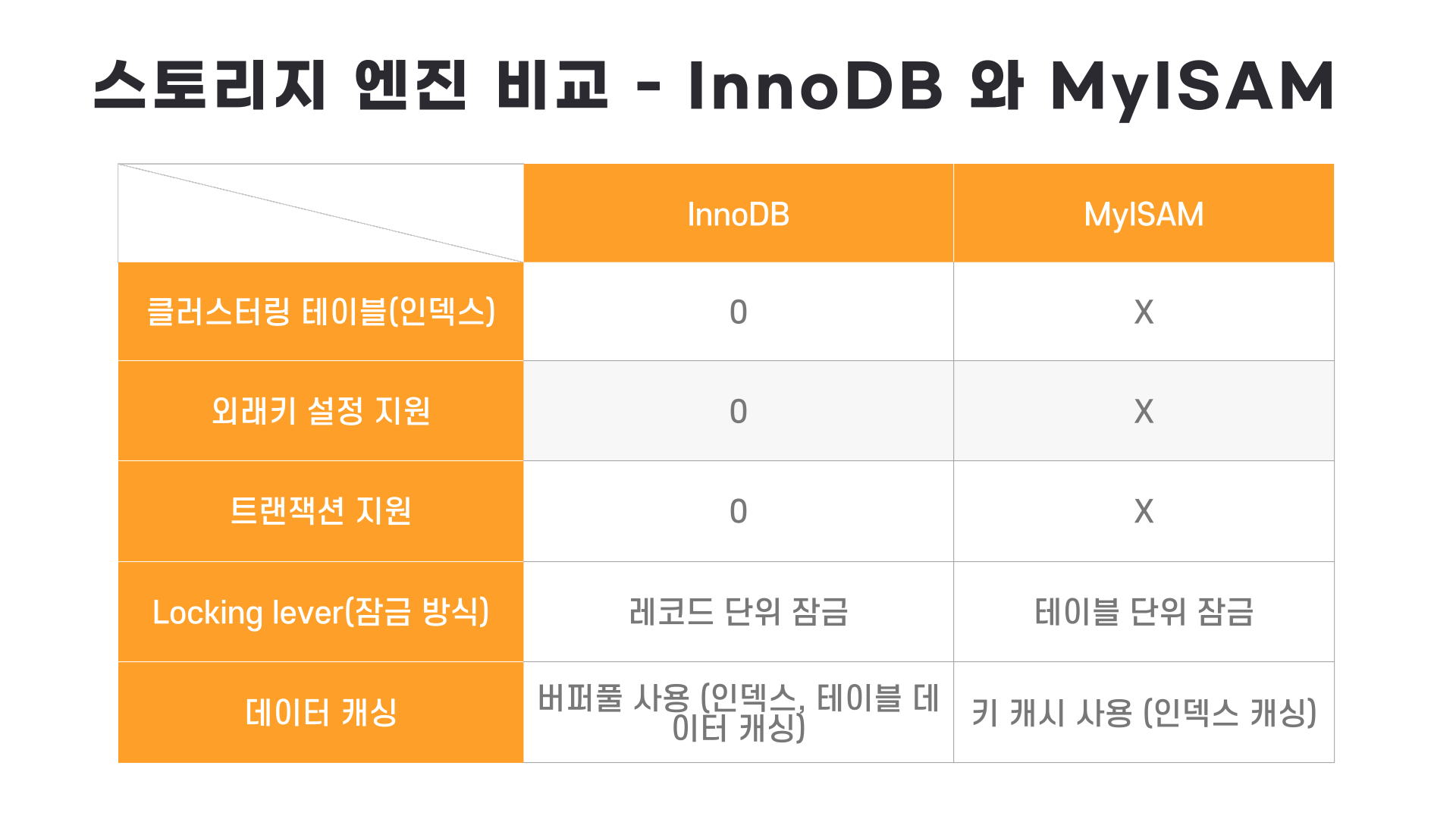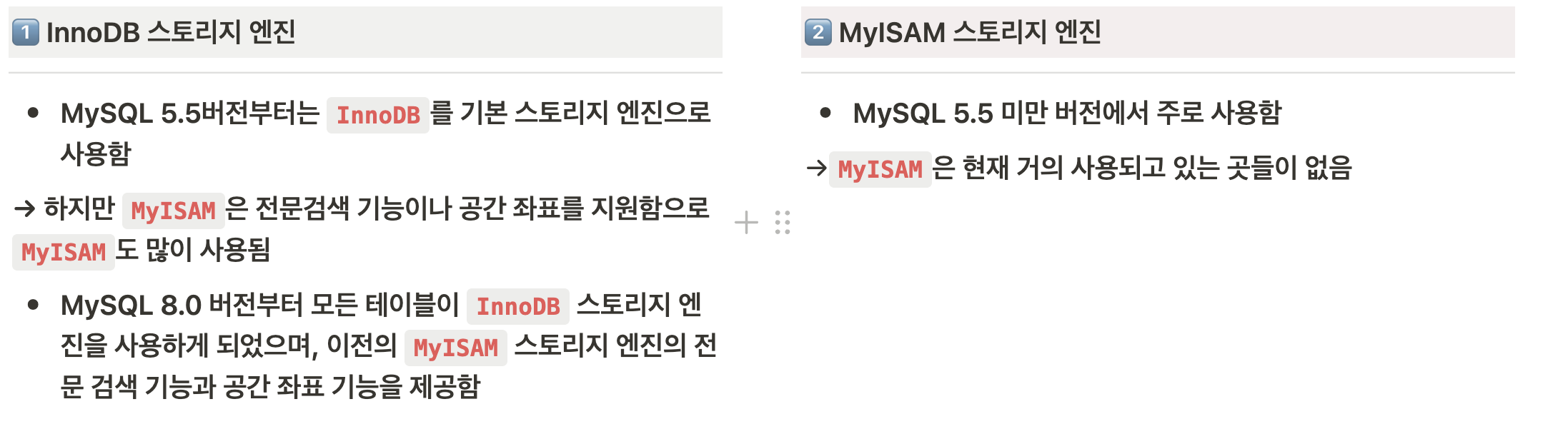 - MySQL의 스토리지 엔진은 여러 스토리지 엔진이 있으며 크게 InnoDB, MyISAM 스토리지 엔진을 주로 사용합니다.