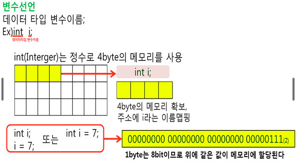 - int형 변수라는 것을 선언하고 7이라는 값을 할당한 후, 메모리에 저장된 값을 가져올 때 i 라는 변수를 통해서 접근하겠다는 의미입니다.