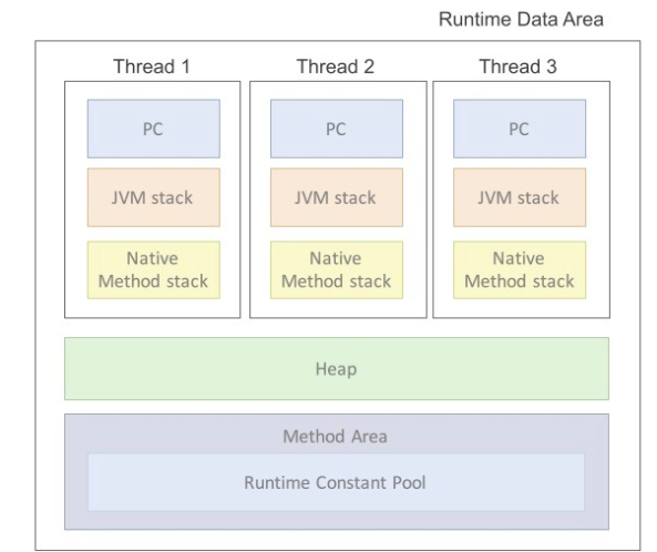 ■Runtime Data Area Runtime Data Area는 JVM이 프로그램을 수행하기 위해 OS로부터 할당받는 메모리 영역이다. WAS의 성능에 문제가 발생했을 때, 대부분 이 영역들이 원인이 된다. (Memory Leak 혹은 GC) Runtime